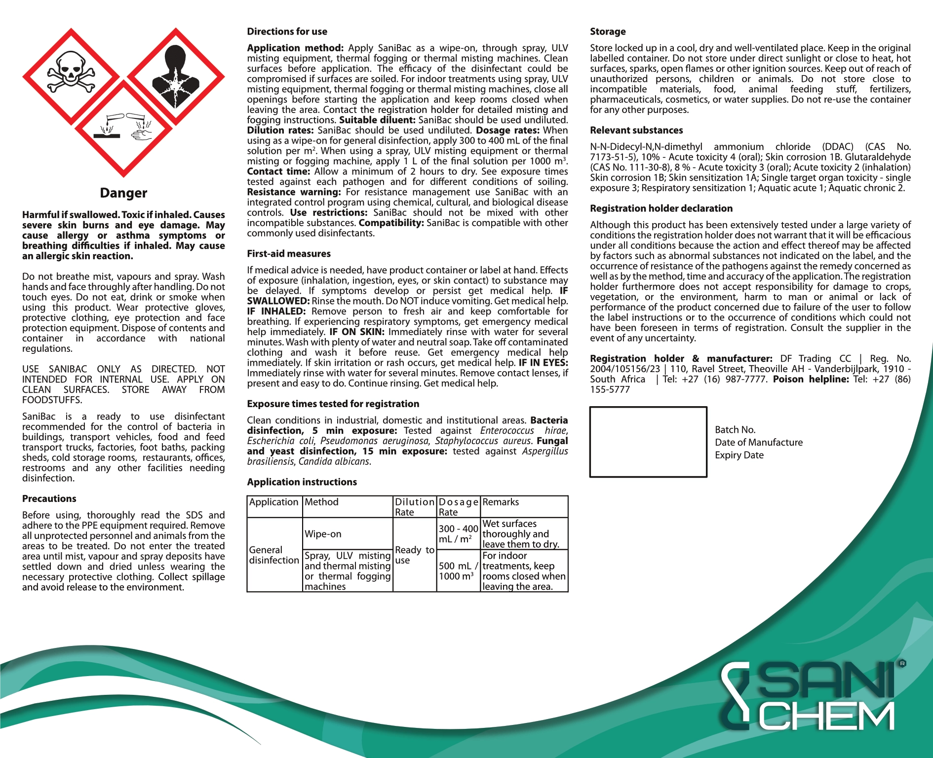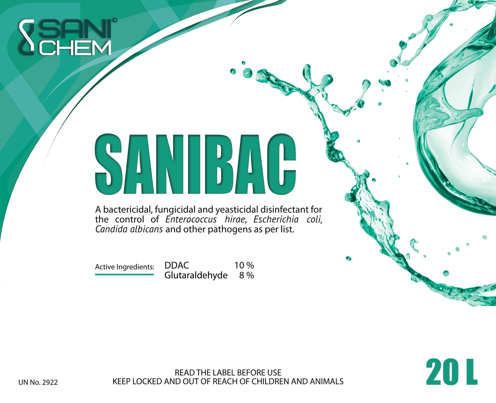 SaniBac, your ultimate sanitation solution, was created from a unique modification of the established DDAC chemistry, resulting in an even more potent and less toxic disinfectant. The addition of Glutaraldehyde to the SaniBac formula amplifies kill rates against a broad spectrum of pathogens while simultaneously helping combat resistance development. SaniBac’s efficacy and affordability create a much-needed sanitisation agent in various industries, from poultry to food and healthcare.